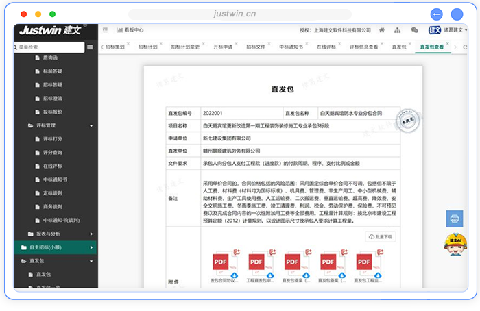 直发包评审:集成在线协同评审工具,支持多部门对直发包方案、供应商资质及预算合理性进行标注、批注与合规性校验,系统自动生成评审报告并留存修改痕迹,保障评审过程严谨规范。