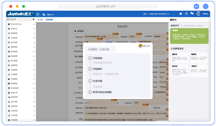 AI录单:借助建文AI Agent技术自动解析合同文本,精准提取关键信息并自动填报到相应字段,极大缩短合同拟定时间,降低人工录入错误率,提升合同处理效率与准确性。