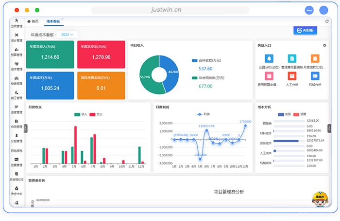成本核算:按项目、成本科目或清单归集实际成本(分包、材料、人工等),通过多维度数据穿透分析,精准定位成本偏差来源,为成本优化提供数据支撑。
