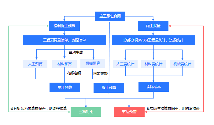 直接费:通过项目现场施工报量/施工产值上报的数据采集:已完成工程量×施工预算单价形成动态成本,实时与目标成本比对并触发预警。